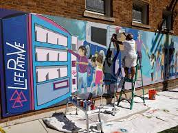 The mural on the side of Neuhauser Pharmacy, on the corner of Monroe and Harrison streets, depicts a line of children of color standing in front of a vending machine. Bad stuff is being handed out by a white woman, while African American and Latino adults want to bring healthful things, but are being blocked.