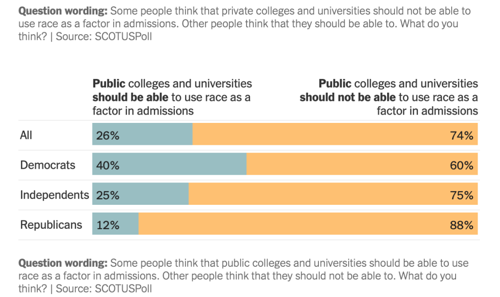 Affirmative action is unpopular. Only 26% of Americans support using race as a factor in admissions to public universities while 74% oppose it. In fact only 40% of Democrats support that.