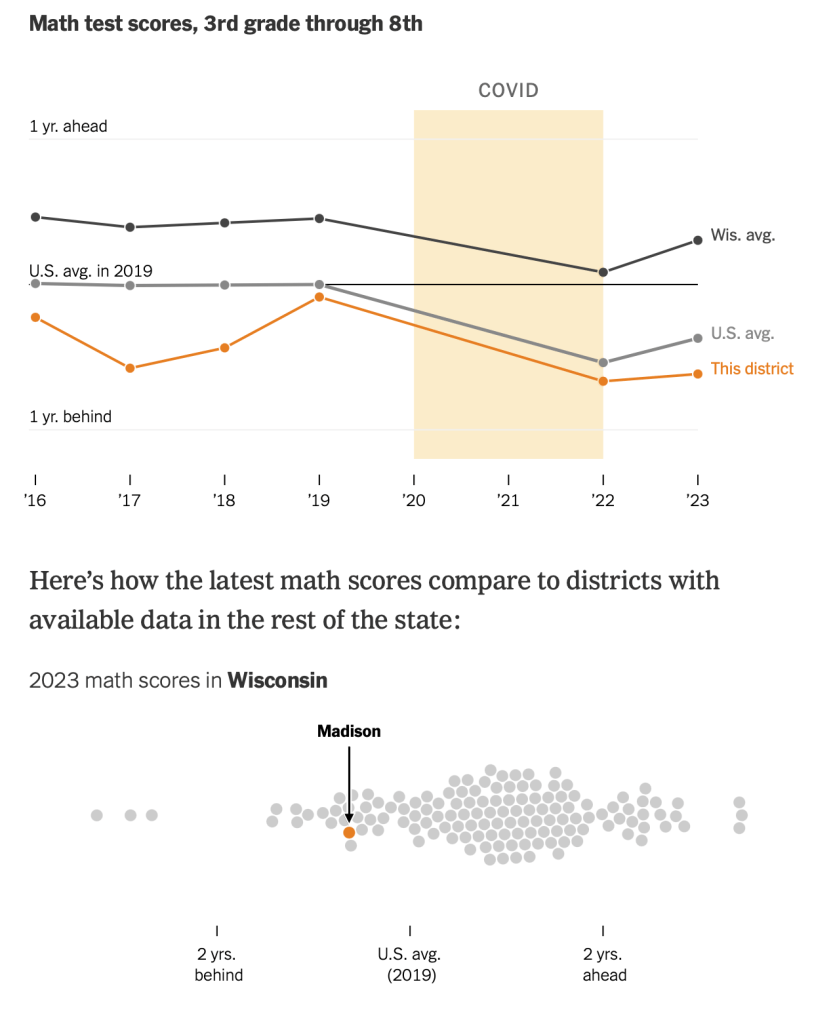 That’s concerning because MMSD’s record in that regard is not good. This morning the New York Times ran a story that allowed readers to check on how their district was performing with regard to math test scores. Here’s the chart for Madison: