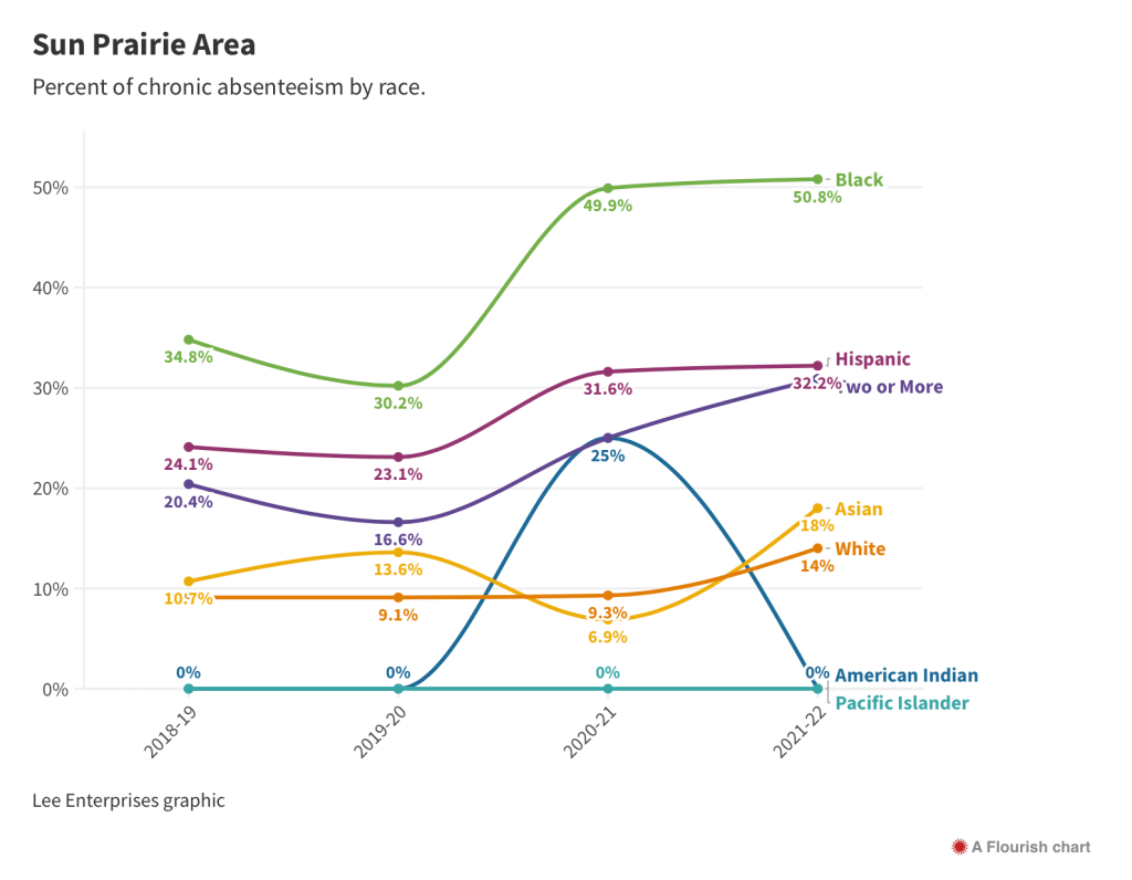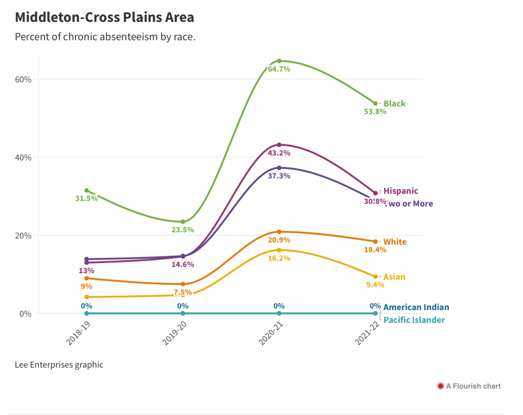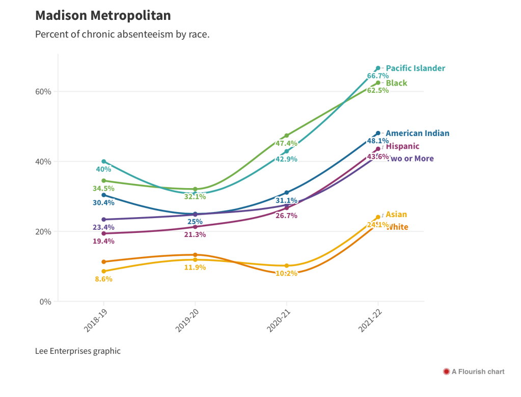 Absenteeism is particularly bad for Black and Hispanic kids in all three districts, but it’s much worse in Madison. Absenteeism for Black students is at 63% in Madison, 51% in Sun Prairie and 54% in Middleton. And while the trends are improving in Middleton and have stabilized in Sun Prairie, they’re still getting worse in Madison.