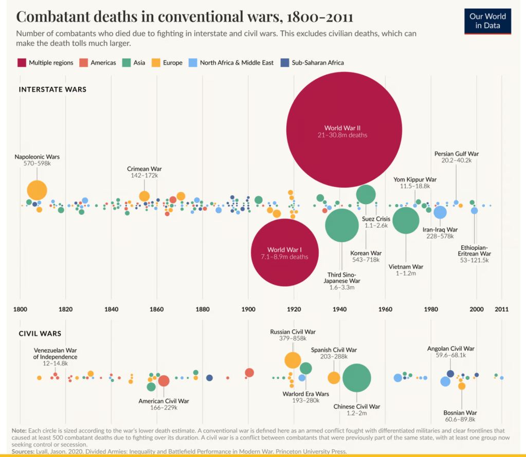 Let’s start with some good news. Despite the awful things happening in Gaza and Ukraine, overall since WW II we have lived in one of the most peaceful eras in human history. The chart below, provided by Our World Data, shows the number of soldiers killed (it doesn’t count civilians killed directly or as the result of starvation or diseases or policies, like the Holocaust) in wars going back to 1800. What you notice is that before WW I there were a lot of wars and the bigger ones were in Europe, but they didn’t usually kill a lot of people compared to what was to come.