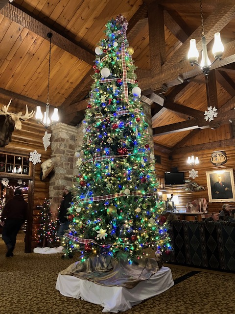 Then I moved into the big dining room where I had the dinner special, which was pot roast and mashed potatoes in gravy, and the soup, which was beer-cheese and ham. There may have been another cocktail involved along the way. Then I went out into the lobby with its A-frame timber ceiling, it’s giant fireplace — you could walk into it — and it’s Christmas trees, and sat down in a comfortable old chair to read a book for awhile. I was waiting for the official notification from WE Energies that power had been restored. That came at about 6:30 PM, almost two full days after the power had gone out.