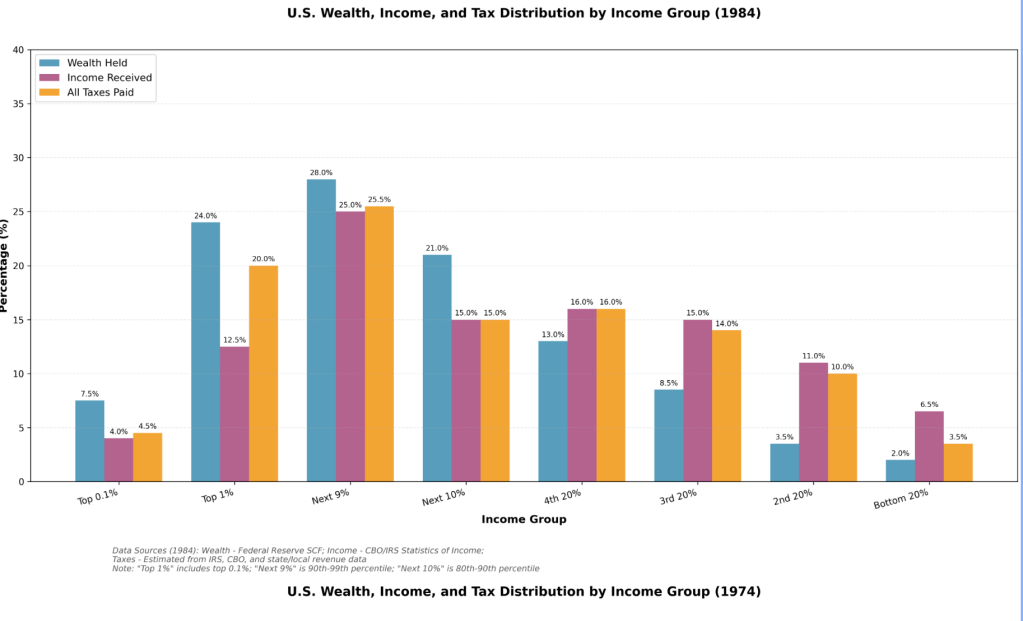 Bottom 20% wealth share has collapsed from 3.0% (1954) to just 0.5% (2024)—an 83% decline. Their income share also fell from 8.0% to 5.0%, while their tax burden remained roughly proportional, meaning they pay about the same rate as the middle class despite far lower resources.